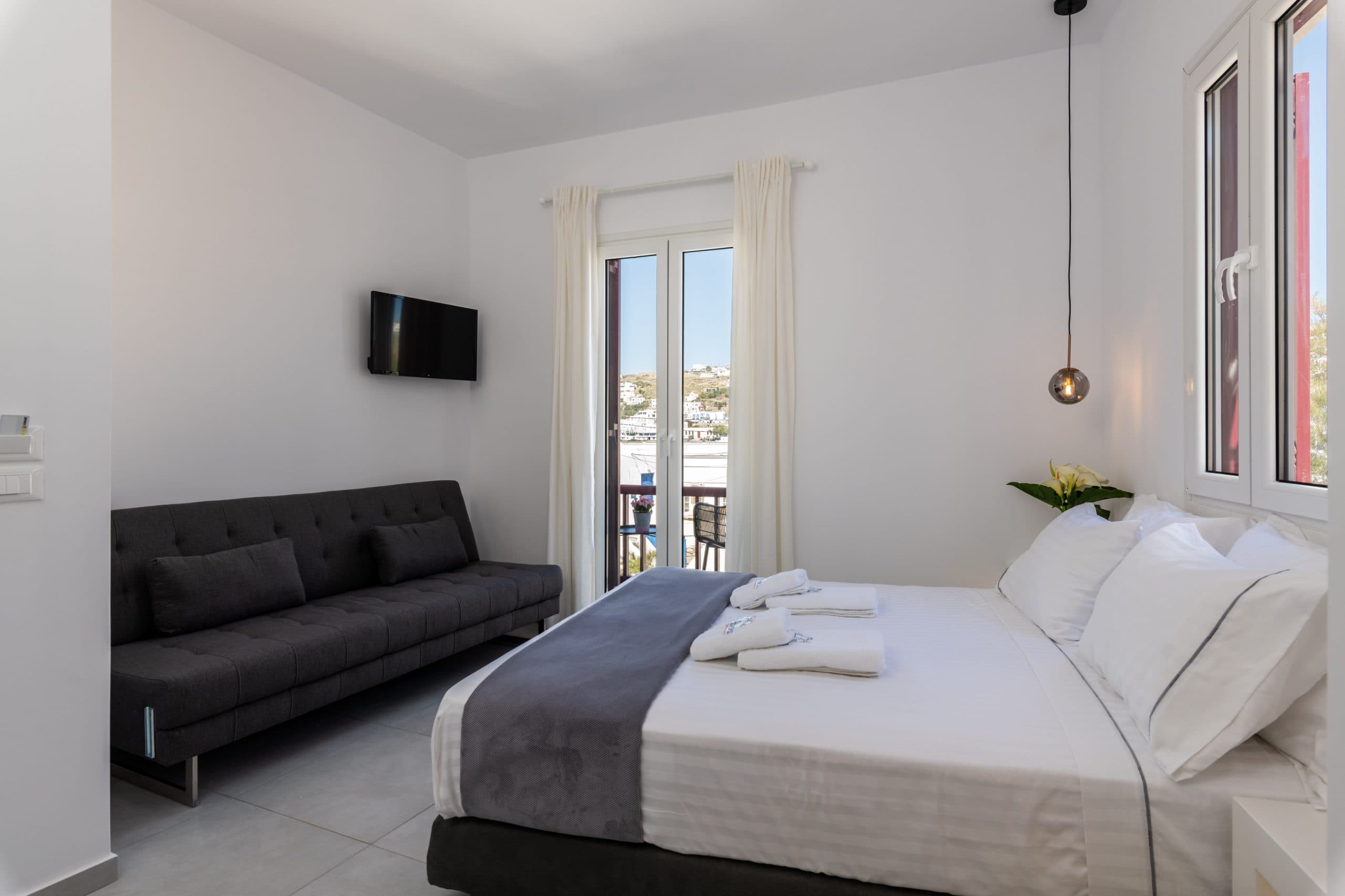 Amazing modern and newly built rooms with an amazing view of the sunset. The location is ideal, 1 min away from the Windmills and Mykonos town.
